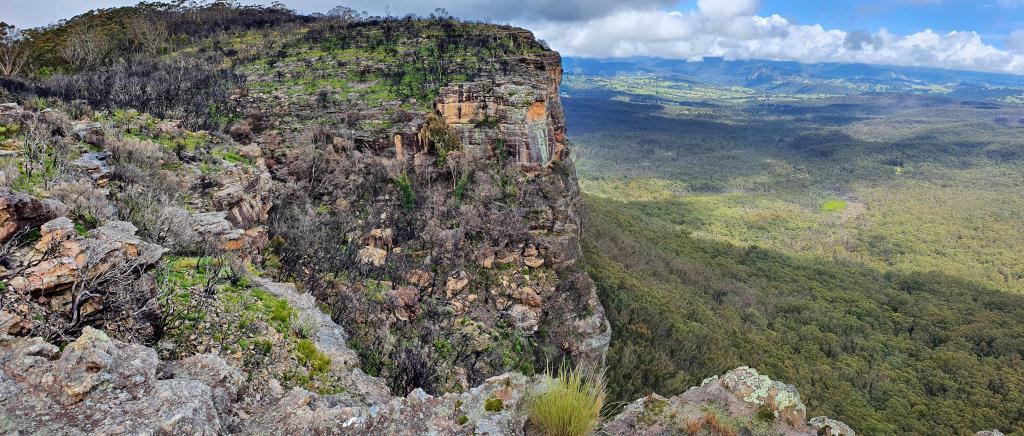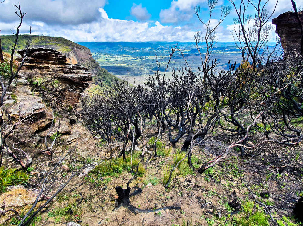 My route took me down, negotiating burnt trees that insist on leaving charcoal stains all over your clothing, stumbling over uneven ground and constantly trying to pick a route where you can get through.  I came out further north than when I’d been here previously, which turned out to be a bonus because it offered more photo opportunities before I swung back to reach the only satisfactory viewing point, a scarred bit of wet uneven sandstone jutting out over an abyss dotted here and there with abseilers anchor points.