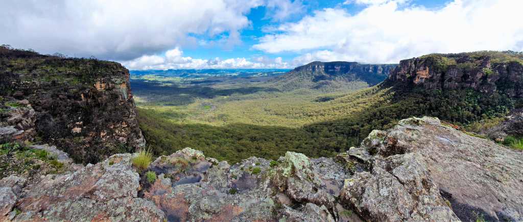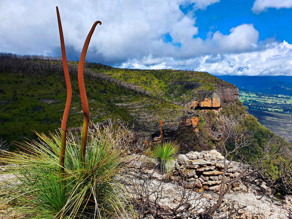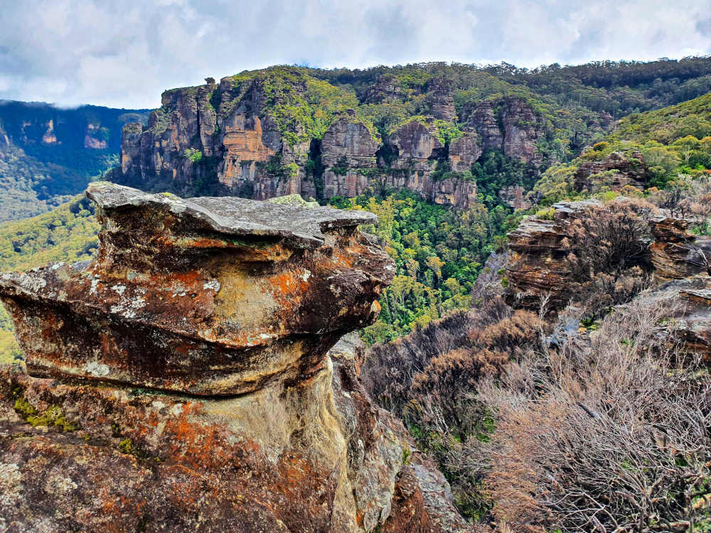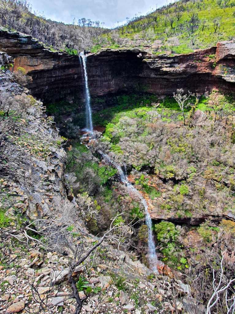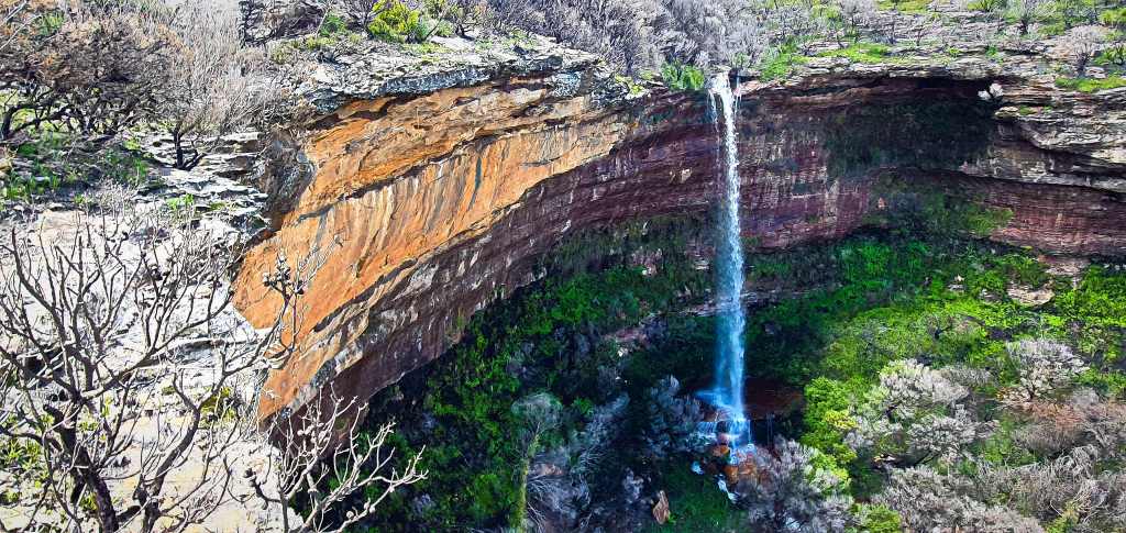 Here, conquering your fear factor is a must if you want a shot or simply to savour this spectacular cascade that rolls over the edge of a severely undercut ledge before plummeting into the Megalong Valley below, crashing along terraces after it hits the bottom.  It’s an awesome sight that never leaves you once you’ve witnessed it and now was a favourable time to view it because the bushfires had stripped all the foliage away and the new rains fed the waters.