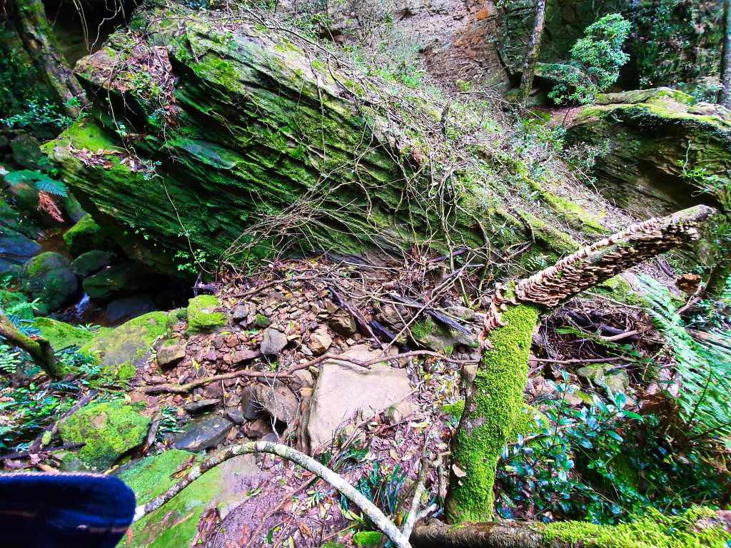 The stream twisted every which way beneath towering cliffs whose cast off remnants formed the natural barrier for the water flow.  Their moss laden presence a reminder that nature isn’t permanent and boulders can fall any time with little warning.  Dead tree branches chose to clutter up some areas and, at one stage the waters cut beneath the cliff which leads one to wonder how long before the next crumbling.