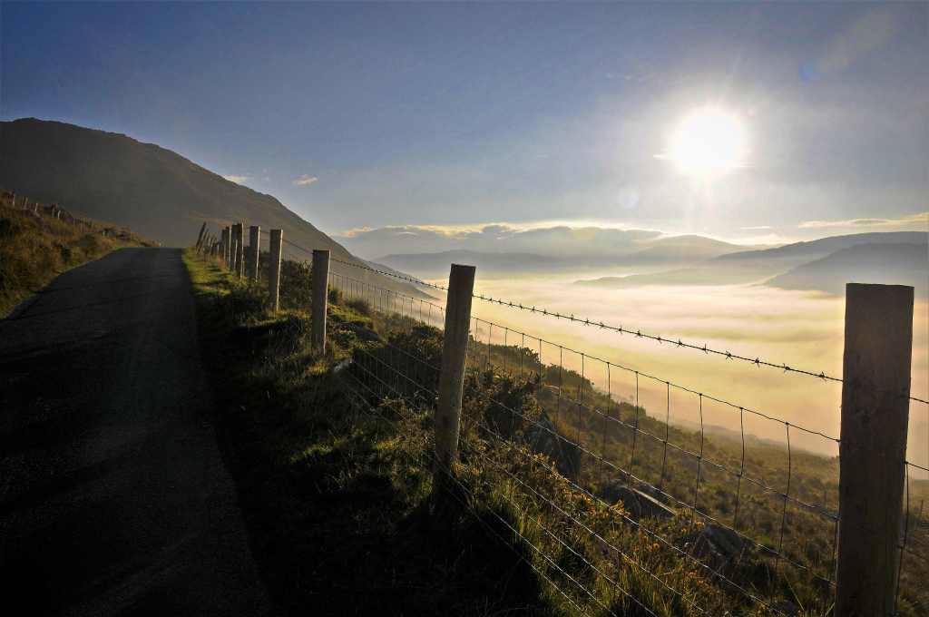 We climb over the Gap for the last time and, despite Lorraine’s focus on moving on, I insist on taking a last picture or two because there’s fog in the valley floor and it looks magic as the sun caresses the top of the mist and highlights the colours of the slopes. Over the crest and down the other side there’s no direct light at all and I manage to stop a couple of times more. Lorraine actually gets out at one and takes her best picture of the trip so far, one of a stone bridge and the water beneath that you can see through all the way to the bottom where the green growth is so clear you’d almost swear the water wasn’t there.