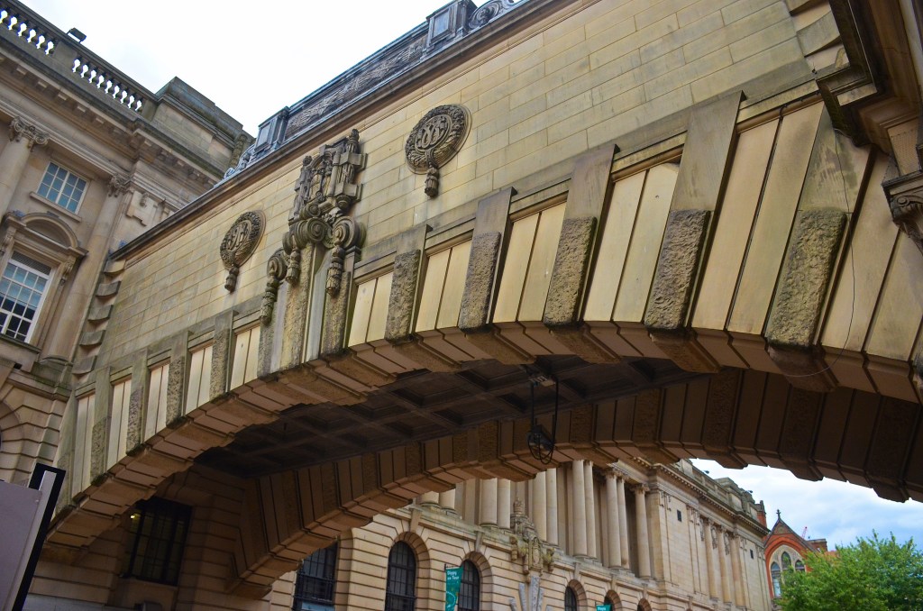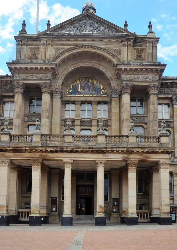 I’m still in the square but looking back at the Council building, another classic-styled entry whose pediment features a bas relief of Britannia receiving the manufacturers of Birmingham while underneath, the facade has a central balcony with a niche under the portico that contains a mosaic tympanum by Salviati featuring Municipality giving “Stability” to Liberty and “Power” to Law, while Science, Art, Commerce and Industry look on.